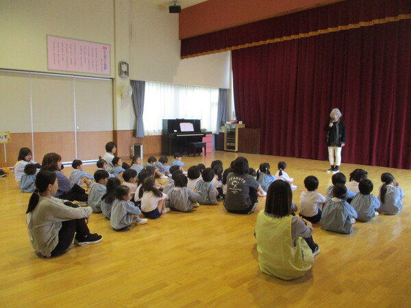 | 一年間たくさんの絵本の読み聞かせや素話を聞かせてもらったり、手あそびやうたあそびを一緒に楽しんだりしてきたお話サークル。毎回楽しみにしていた子どもたちでしたが、今日は今年度お話サークルの最終日でした。 それぞれのクラスで感謝の気持ちをお伝えすることができたようです。 ぞう組さんはこども園のみんなのありがとうの気持ちを形にしようと考えて…。本が好きなお話サークルの方に使ってもらいたいと気持ちを込めてしおりを作ってプレゼント♥ 喜んでいただけて嬉しそうでした。 |